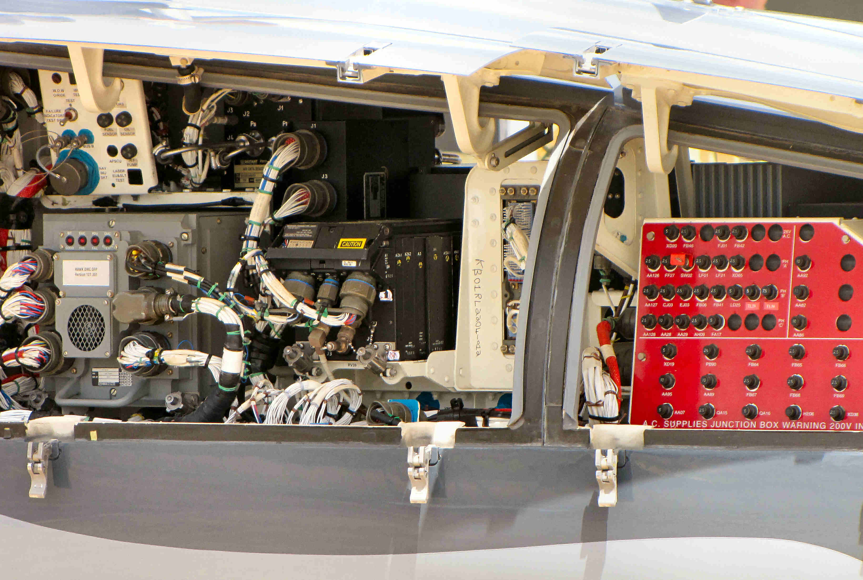 Under the nose of one of the RAAF’s 33 Hawks, where all the electric bits sit, the equipment might have been upgraded, the black boxes have certainly got a lot smaller and a lot lighter, but the wiring and the canon plugs look awfully familiar though the bee’s-wax string seems to have been replaced with cable ties, or as the RAAF calls them, Panduit Straps. |
