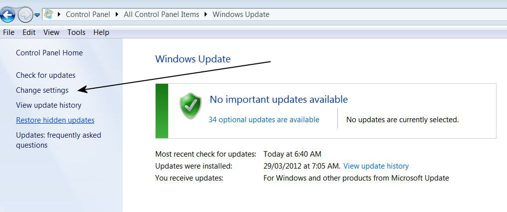 You will see, above the arrowed selection, another option which is “Check for Updates.” Click this and Windows will check your computer and alert you of any updates you need, some will be Important, others Optional. Download the Important ones and select any optional ones you want.