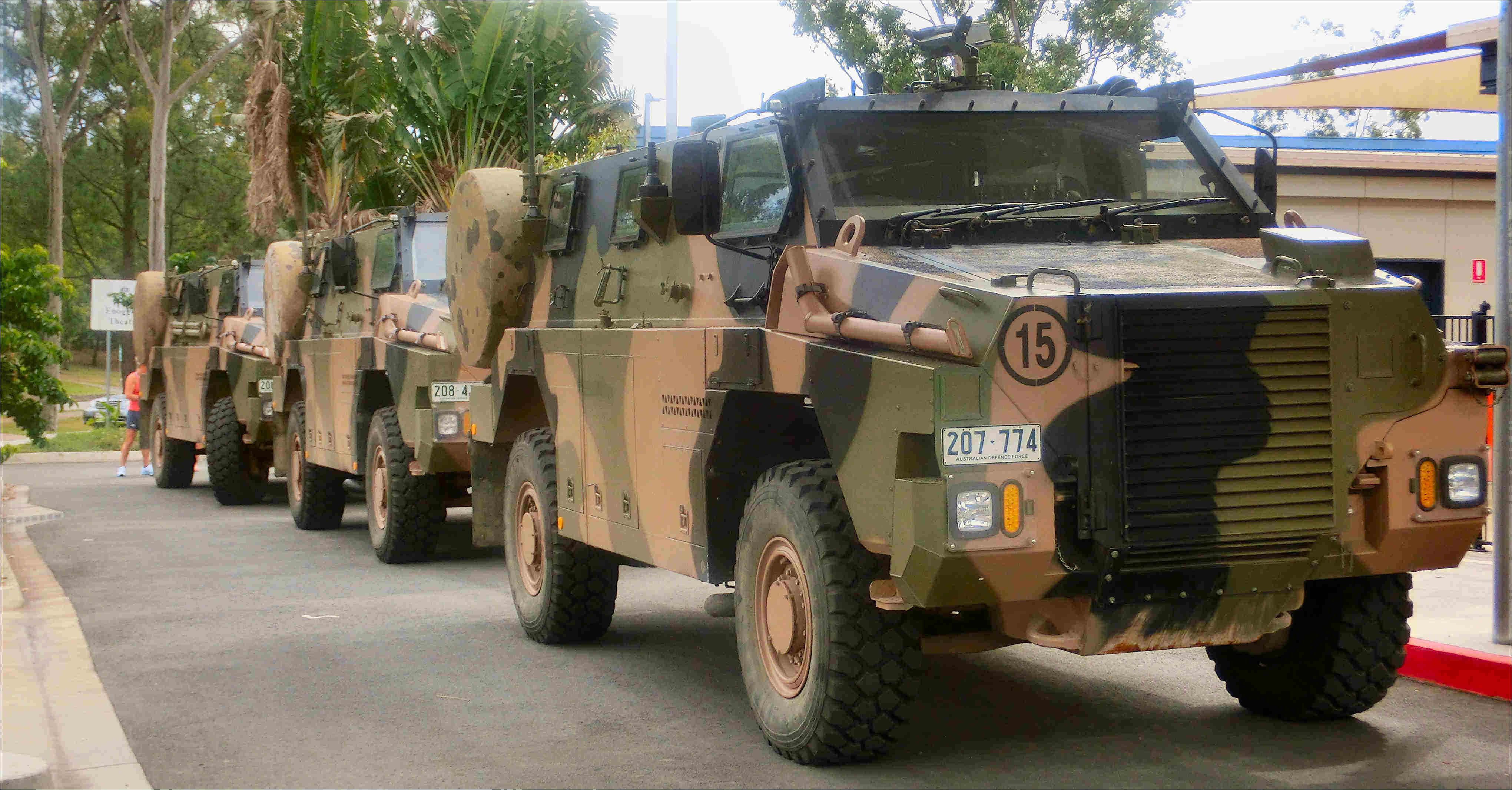 This machine was originally designed and built in 1992 by General Dynamics Land Systems, Canada, for the U.S. Marines. It was redesigned to suit Australian conditions and entered service with the Army in 1995. It is an eight wheeled machine, capable of either four or eight wheel drive, is amphibious and has a range of 600 km with a top road speed of 120 km/h. It is powered by a Detroit Diesel (General Motors) 6V53T, V6 supercharged 2 stroke diesel engine developing 300 hp (220 kW). They would want to be a damn good motor because how you get to the brute to service it is anyone’s guess.