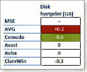 MSE use of disk space was set as the yard-stick and the other programs disk usage was shown as more or less than that of MSE. The table at left shows the results, ie: AVG uses 0.2GB more than MSE but Comodo use 0.6GB less than MSE.