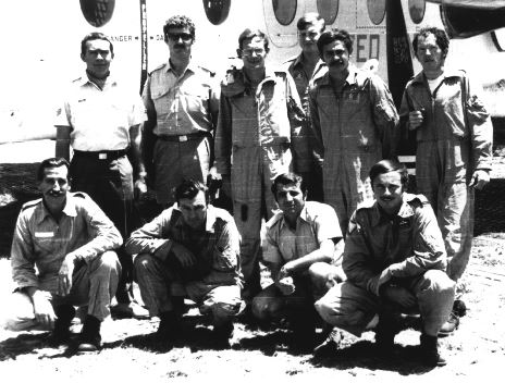 Standing L-R: Bruce Warring (Radio), Maurice Pearson (Elec), Bob Costello (Radio), Peter Coleman (Equip), Peter Rothwell (Inst), Wally Little (Sumpie/Loadie). Kneeling L-R: Sqn Ldr Baillie McKenny (OIC), Kev O’Brien (Sumpie/Loadie), Dickie Jones (Framie), F/O Dick Folvig (Pilot). Missing: F/O Ken Stone (Pilot), F/Sgt Kev “Spider” Bessell (Sumpie and NCO I/C Det B)