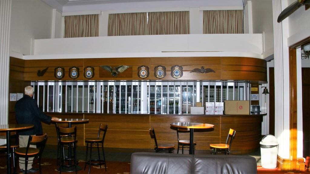 The red carpet with the gold RAAF crest was originally made in Australia specifically for the Laverton Officer’s Mess and can now be found in Air Force messes around the country. The doors at the rear open into the bar area.