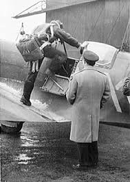 When you have control of the aircraft and in reasonably level flight the recommended method of bailing out from a Spitfire is to disconnect helmet leads, undo the harness and dive over the side onto the wing. Another method is to trim the aircraft nose heavy, keeping level by holding back the control column, then undo your harness and leads and release the control column, the aircraft will then dive sharply and you will be catapulted out of the cockpit. However, in my case the aircraft was in a spin and when I released the harness locking pin I must have been partially or fully thrown out of the cockpit, In the process my helmet, with attached mask was dragged from my head cutting off my oxygen supply. The sudden loss of oxygen must have caused a short period of unconsciousness, hence the period of calm. How long it lasted I don’t know but it must have been only a short period for by this time I was probably below 20,000 feet and getting sufficient oxygen from the surrounding air, enough for me to regain consciousness and resort to my parachute.