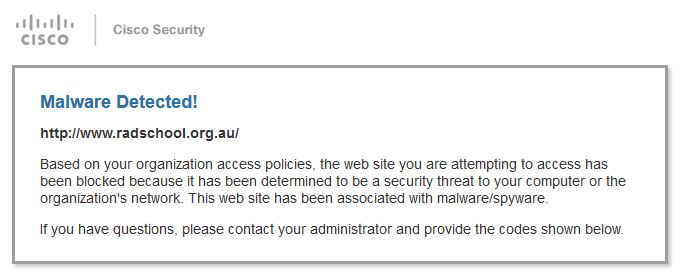 If you’re using Cisco “Advanced Malware Protection” (AMP) I would strongly suggest you dump it and get a program that actually works. Cisco issue false positives, they will brand a web site as containing Malware and even though they know it to be incorrect, will not amend their branding. If you’re using Cisco and you try and log onto the Radschool Site, you will get the message below.