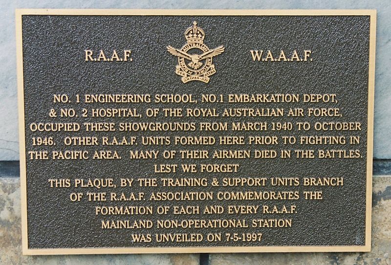 No. 1 Engineering School, No. 1 Embarkation Depot, and No. 2 Hospital of the Royal Australian Air Force occupied the showgrounds from March 1940 to October 1946. The RAAF had spent huge sums on equipping and fitting up various showground buildings as workshops, while the MCG, was used mainly as a personnel depot and transit centre where airmen were mustered before and after movement. The MCG was perfect for this use as the available space and its location were ideal. Aftr the US forces left, at any-one time there were usually about 3,000 RAAF members at the MCG, and 600 airmen from a technical training school were permanently accommodated there.