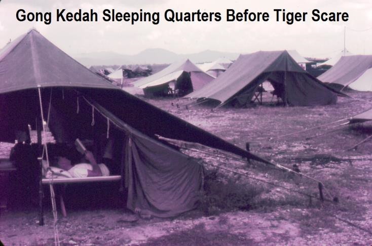 In late 1965 the Butterworth airstrip had to be resurfaced and 2 Squadron was despatched to Gong Kedah an old strip on the opposite side of Malaysia used as a forward base to attack the terrorists and still showing WW2 bomb pockmarks alongside the strip, no buildings, we lived in tents. We weren’t far from the Thai border and Chin Ping and his Communist Terrorists were still operating in this area so we had a roster of guys guarding the aircraft every night. One night we were all awoken by a rifle shot and ran over to see one of our guys standing, still shaking with his rifle in one hand and his guard dog lead in the other. Apparently, his dog started growling and snarling and the guy shone his torch around to see a tiger crouched ready to pounce on him. He had frozen with fear, luckily the tiger bounded off and he fired after it. Prior to this we had all had our tents un-staked with the flaps thrown over the top because of the heat, after this we had them staked every foot and the fly’s laced up like a boot.