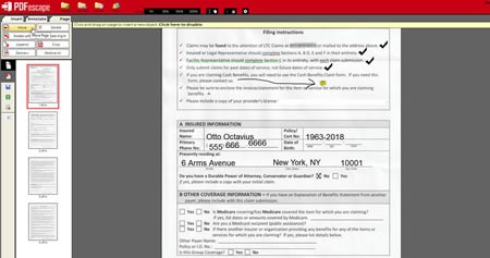 Launch the PDFescape Online PDF Editor and upload the PDF you want to edit. From the Insert tab, you can add text, an image, and a hyperlink. You can white out any content, draw an image by freehand, and create a form field.