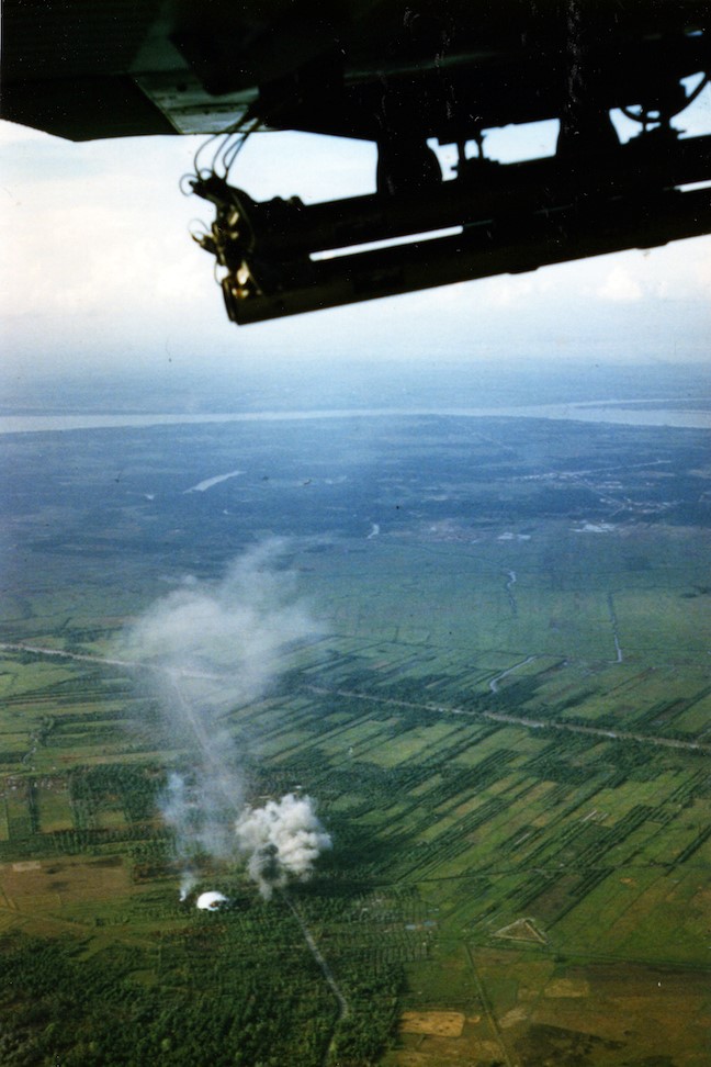 I took this photo from the backseat soon after I arrived at Dong Tam. Looking south, it shows the north arm of the Mekong River in the distance and four rocket tubes under the wing. On the ground we can see a bright white WP smoke just blooming alongside a burnt-out smoke rocket. The larger smoke blooms are the result of bombs hitting the target nearer to the canal.