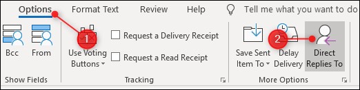 Once you’ve created your mail, switch to the “Options” tab and then click the “Direct Replies To” button. (Depending on your version of Outlook, you might need to click File > Properties instead.) |