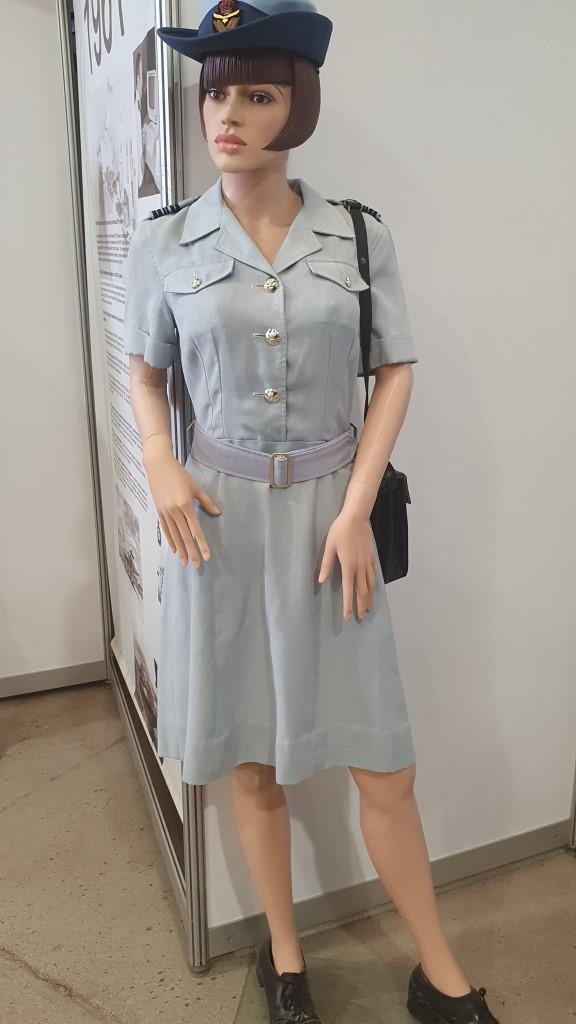 The summer dress, a blue grey rayon long sleeved frock was quite a change from the old khaki drill shirt and skirt. A blue forage cap with light blue piping replaced the peaked cap of the WRAAF winter uniform, the new jacket was fitted to be worn without a belt, and a box pleat was added to the navy skirt. Minor but popular additions to the uniform comprised a black leather sling shoulder bag, black (instead of tan) gloves and nylons. Permission to fold handbag strap and carry the handbag over the wrist was given in 1960.